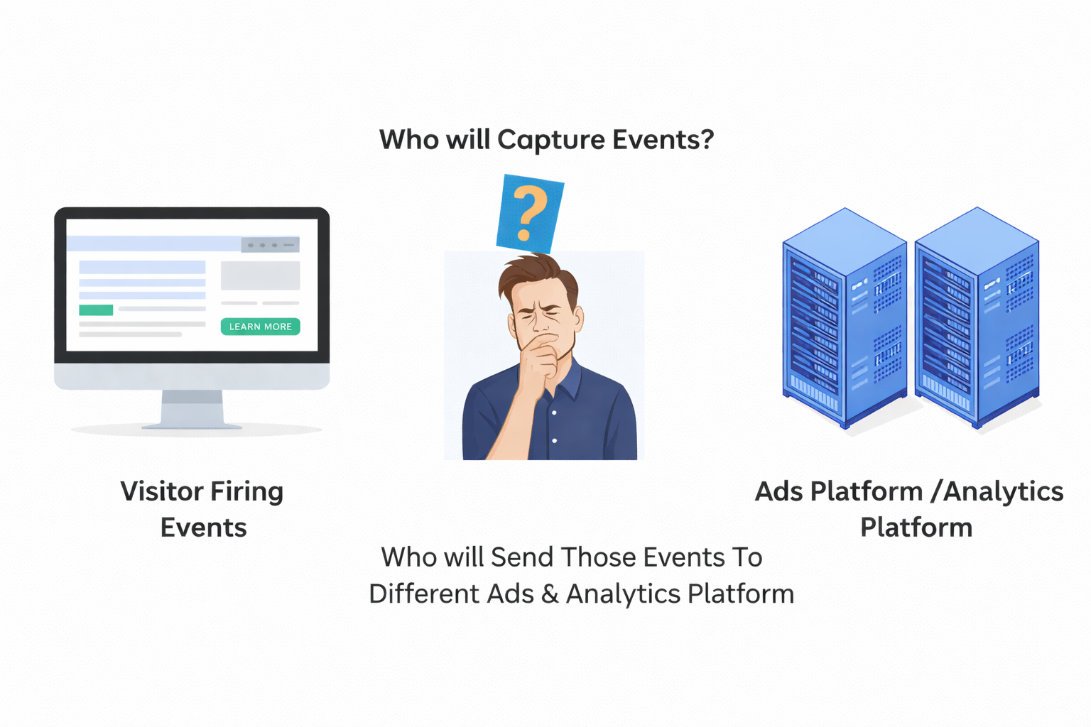 When traffic completes one or more events on your site, GTM begins its work. That means when someone visits your site and completes the targeted events, Google Tag Manager captures those events and sends all of them to your analytics or to your campaign manager.
